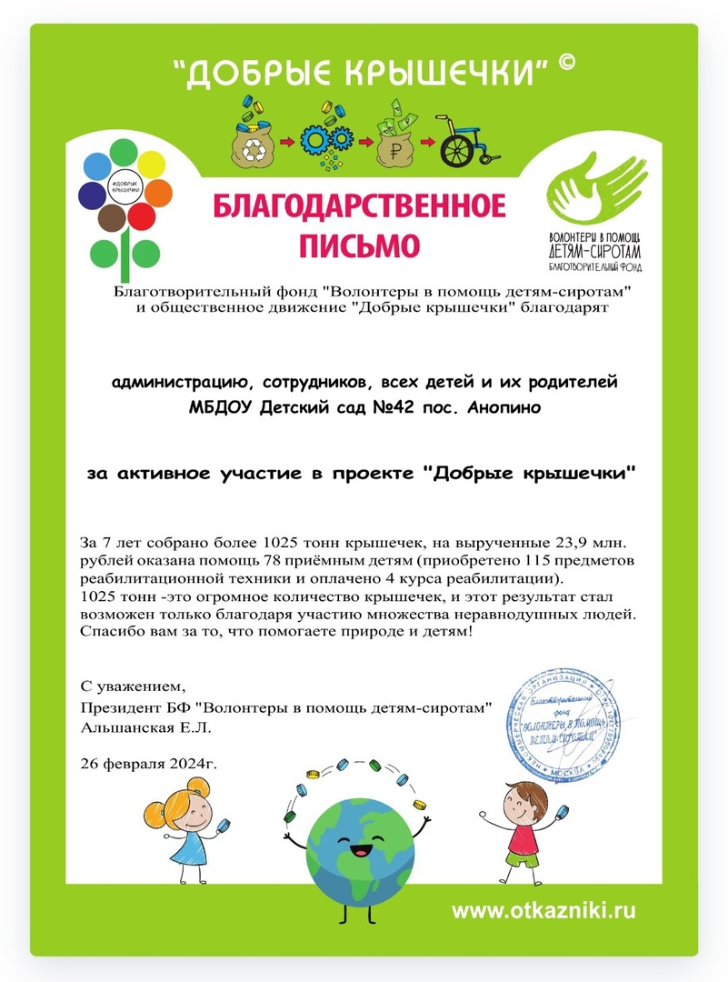 Благотворительный фонд "Волонтеры в помощь детям-сиротам" в лице президента Е.А.Альшанской выражает благодарность детям и их родителям, сотрудникам ДОУ за активное участие в проекте!